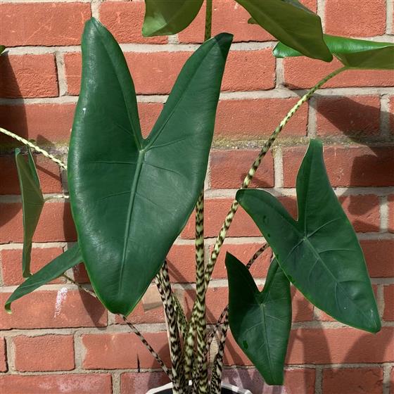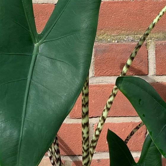 This gorgeous member of the Alocasia family has unique striped stems and large green leaves, a popular favourite and necessary addition to any plant lover's collection. Native to the tropical forests of Southeast Asia. Toxic if ingested, keep away from pets and children.
